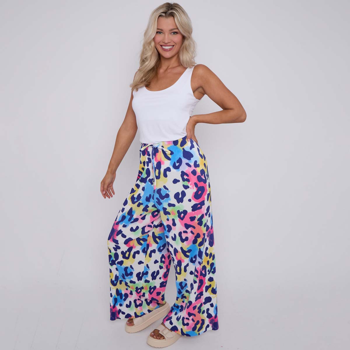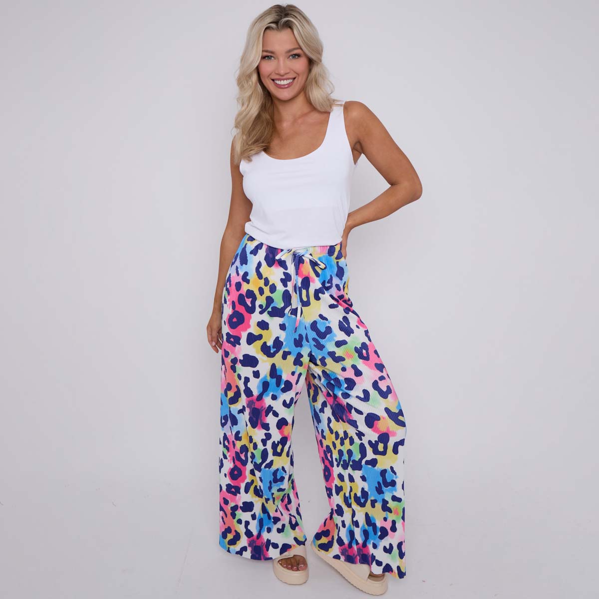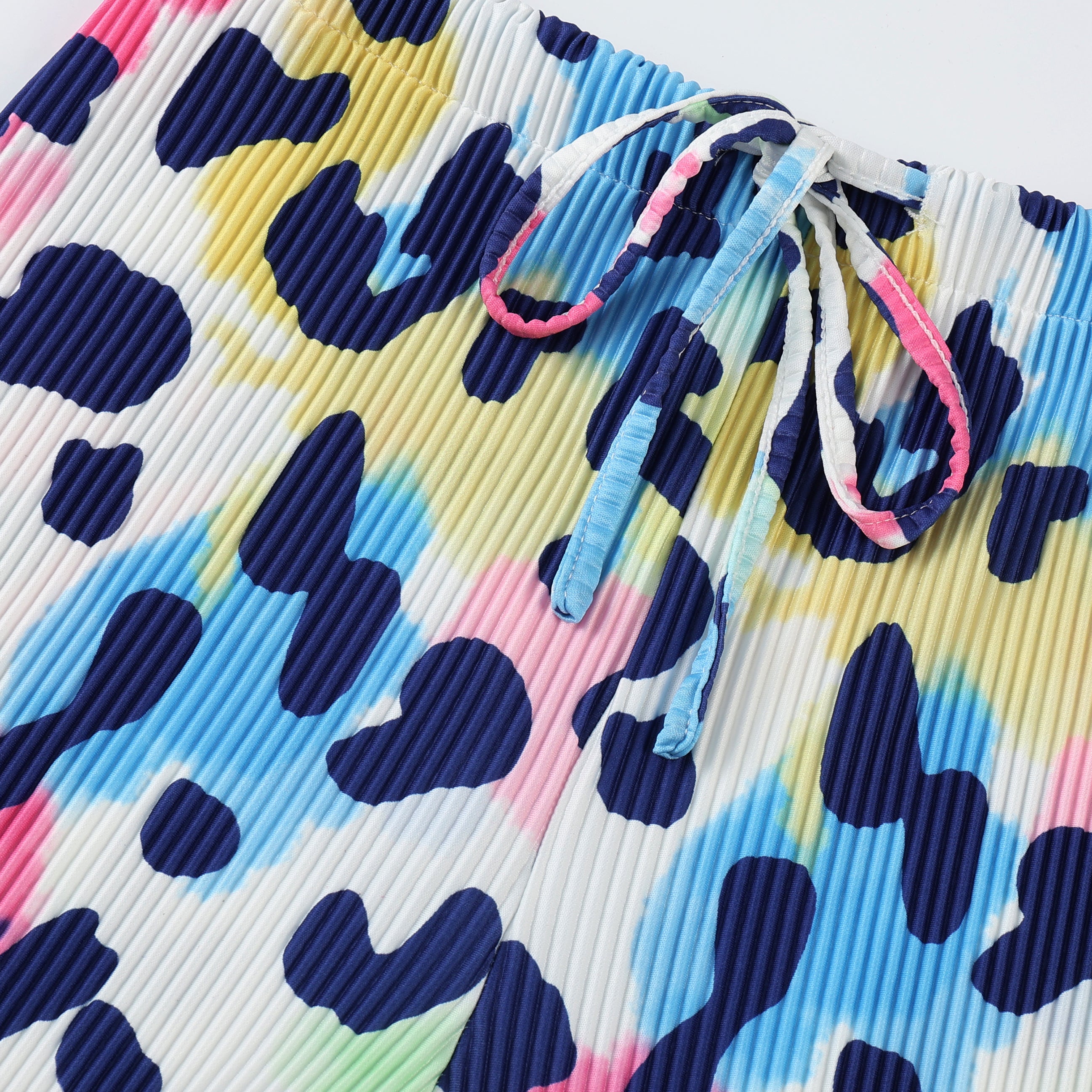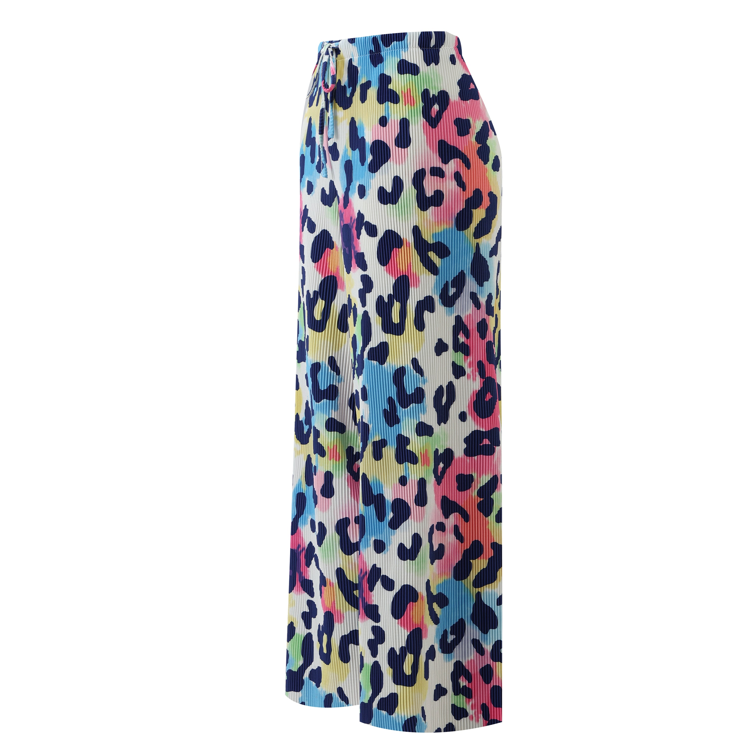 Colorful Leopard Print Abstract Print Wide-Leg Drawstring Palazzo Pleated Pants