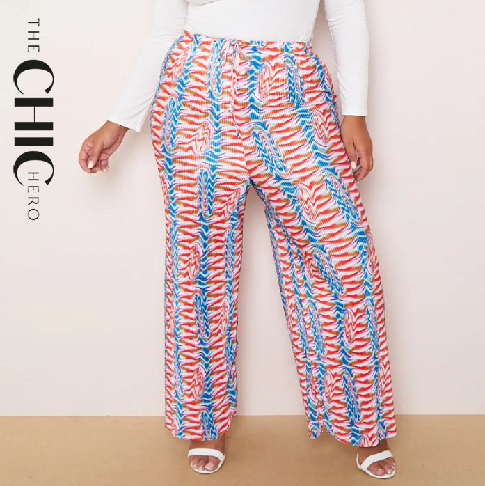 Curved Stripes Abstract Print Wide-Leg Drawstring Palazzo Pleated Pants