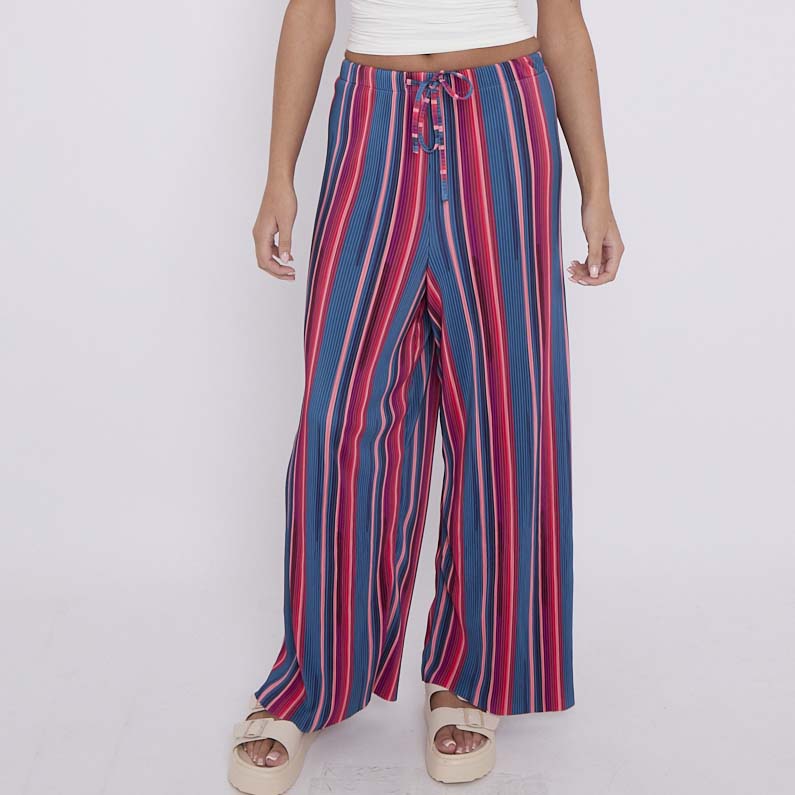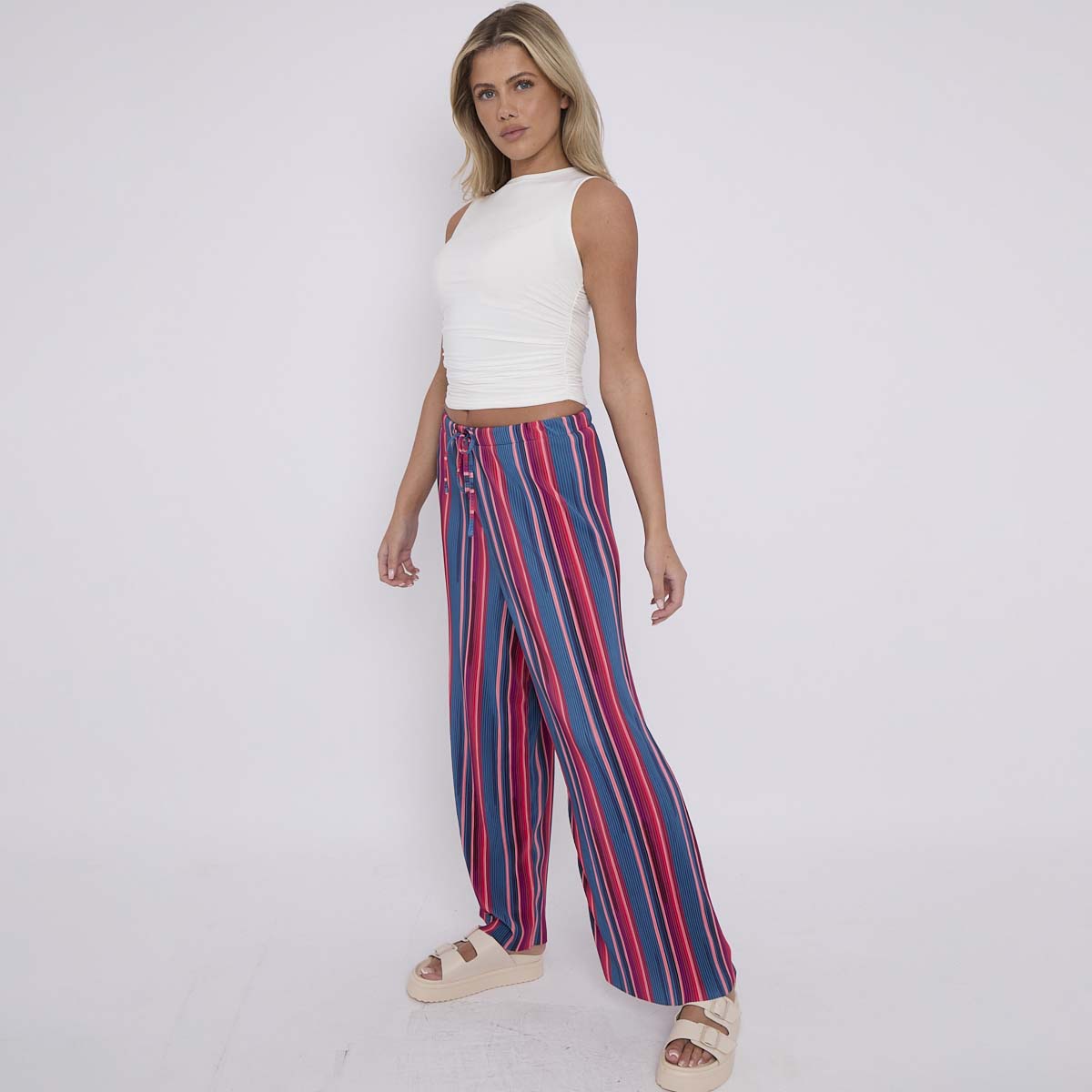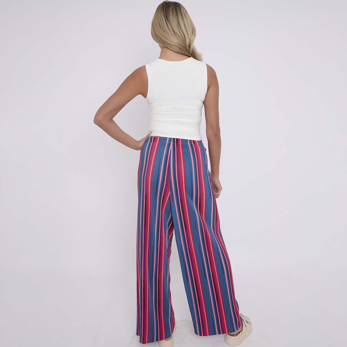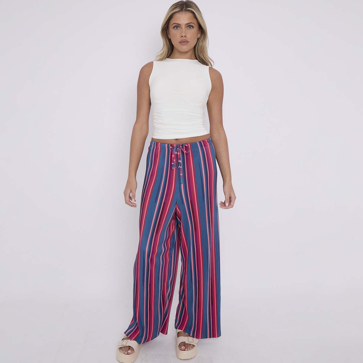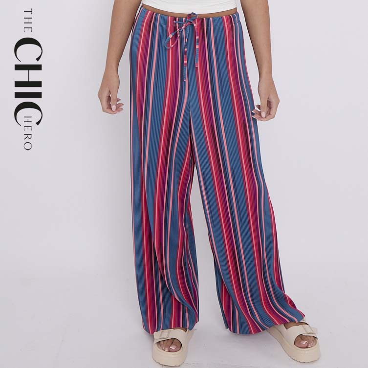 Red Blue Stripe Abstract Print Wide-Leg Drawstring Palazzo Pleated Pants