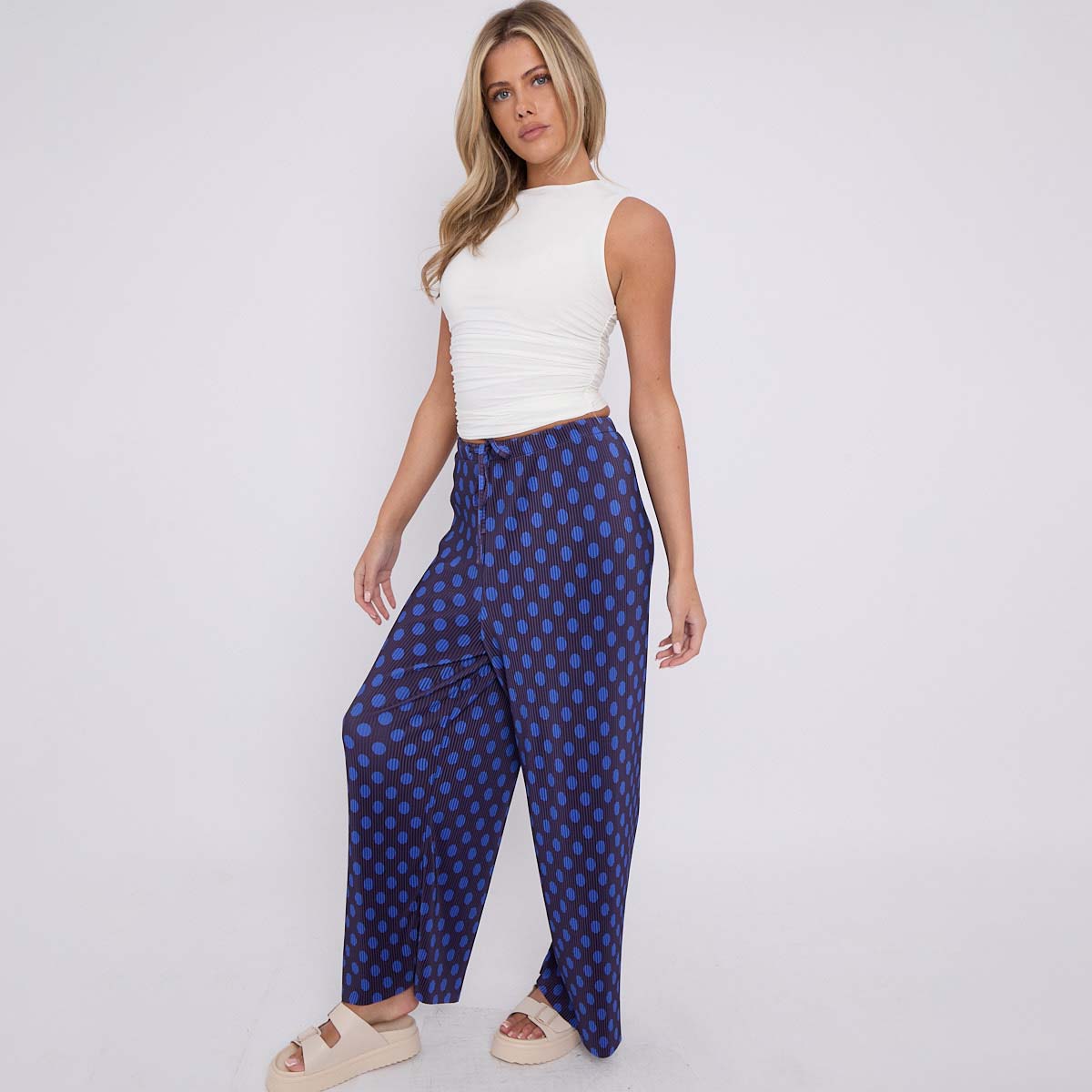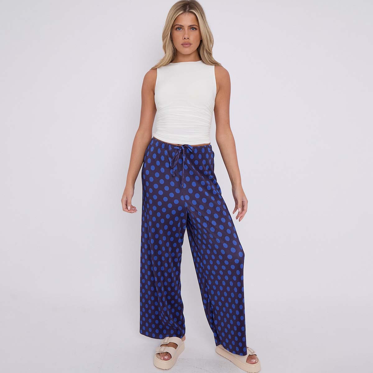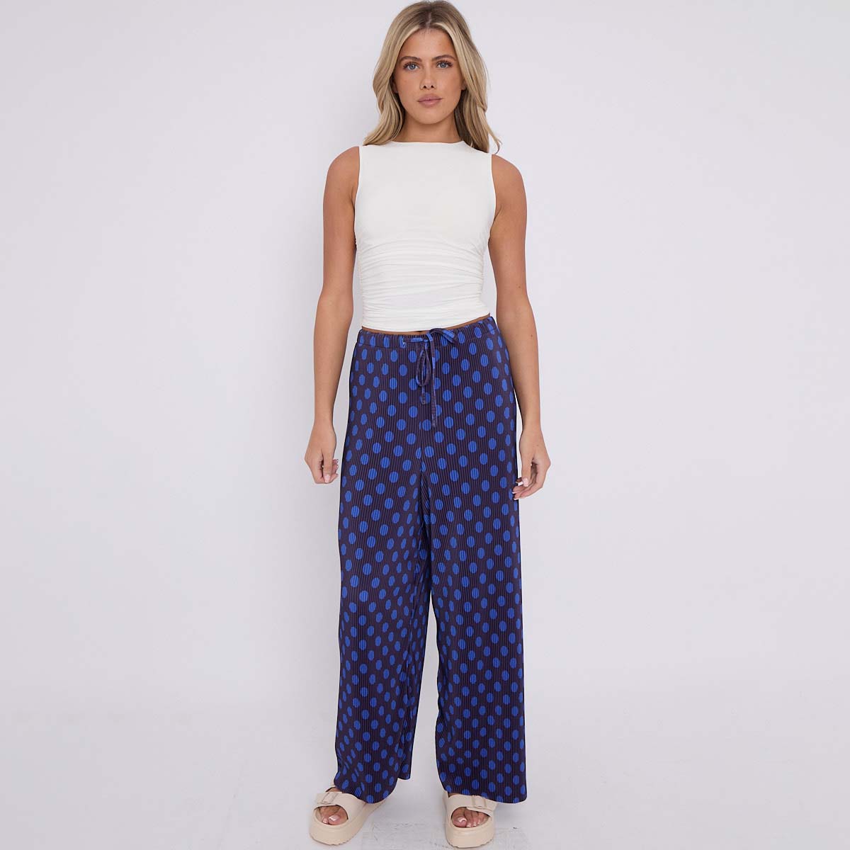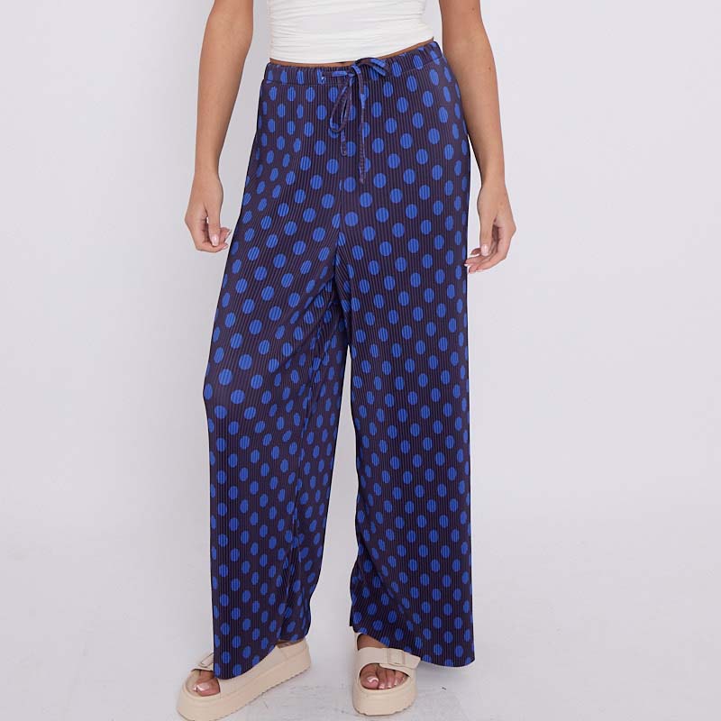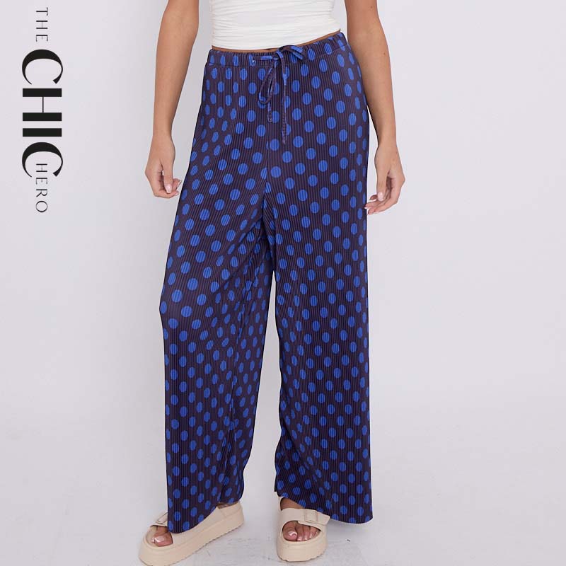 Blue Black Polka DotsPrint Abstract Print Wide-Leg Drawstring Palazzo Pleated Pants