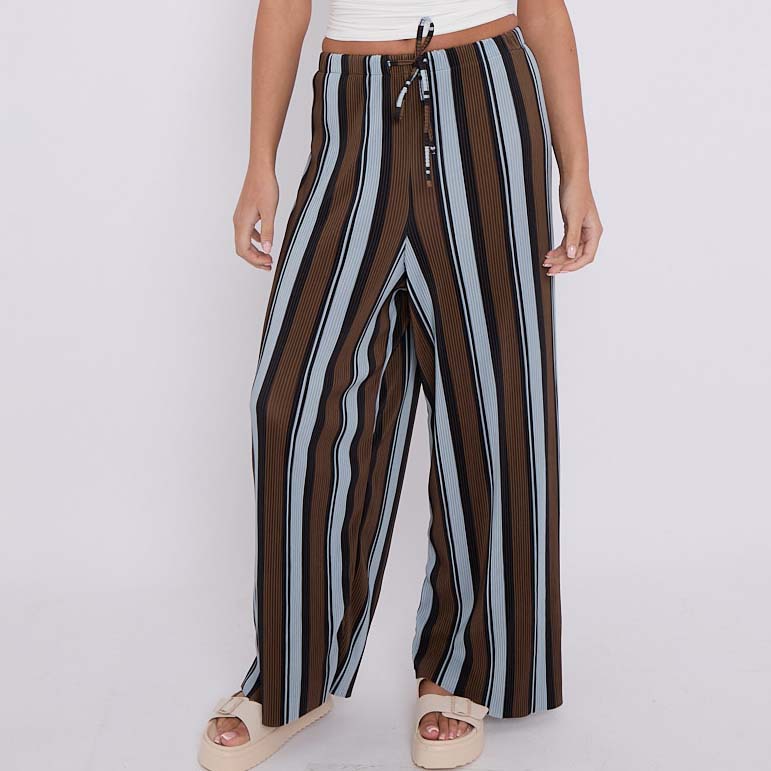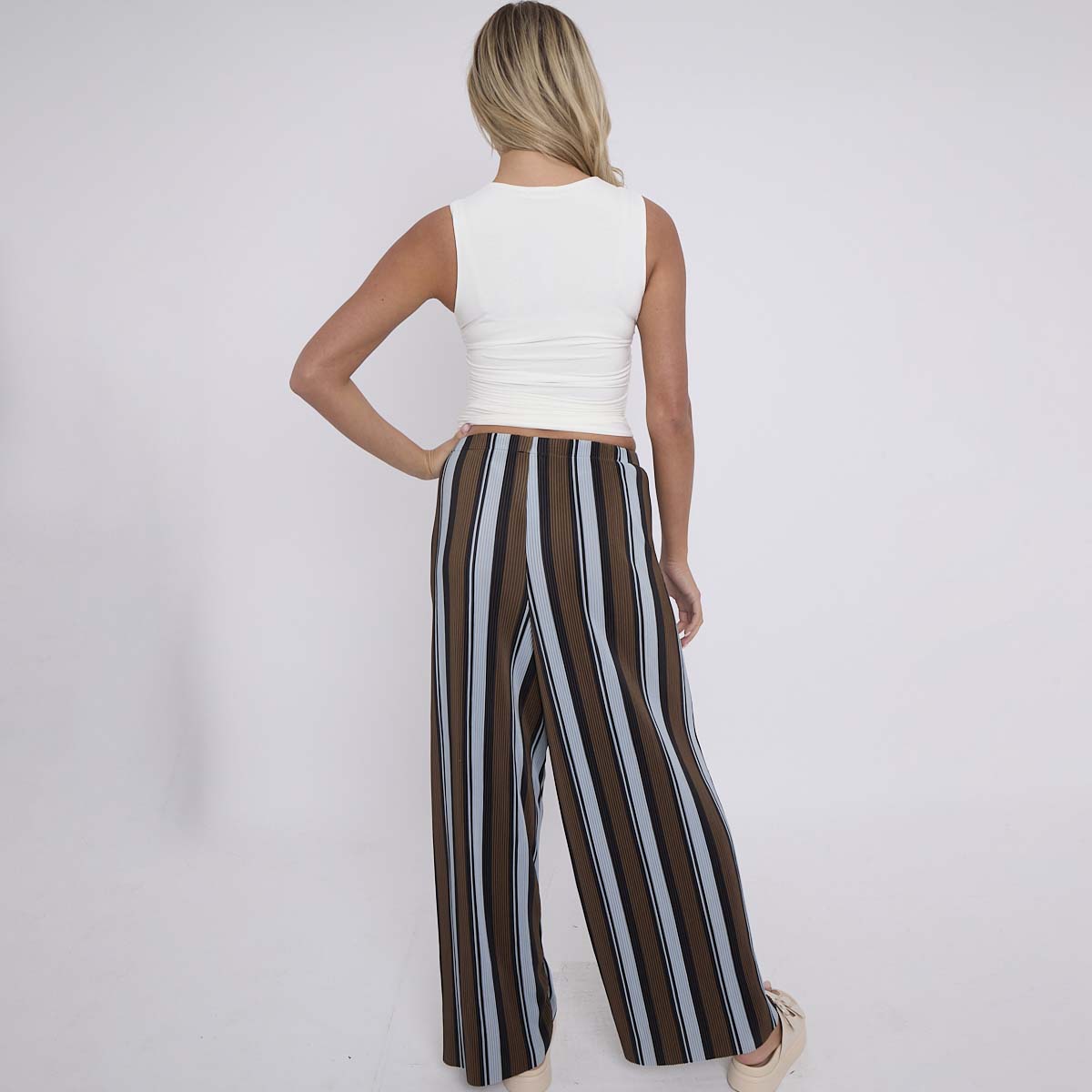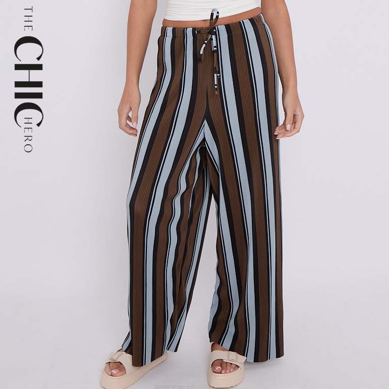 Brown Blue Abstract Print Wide-Leg Drawstring Palazzo Pleated Pants