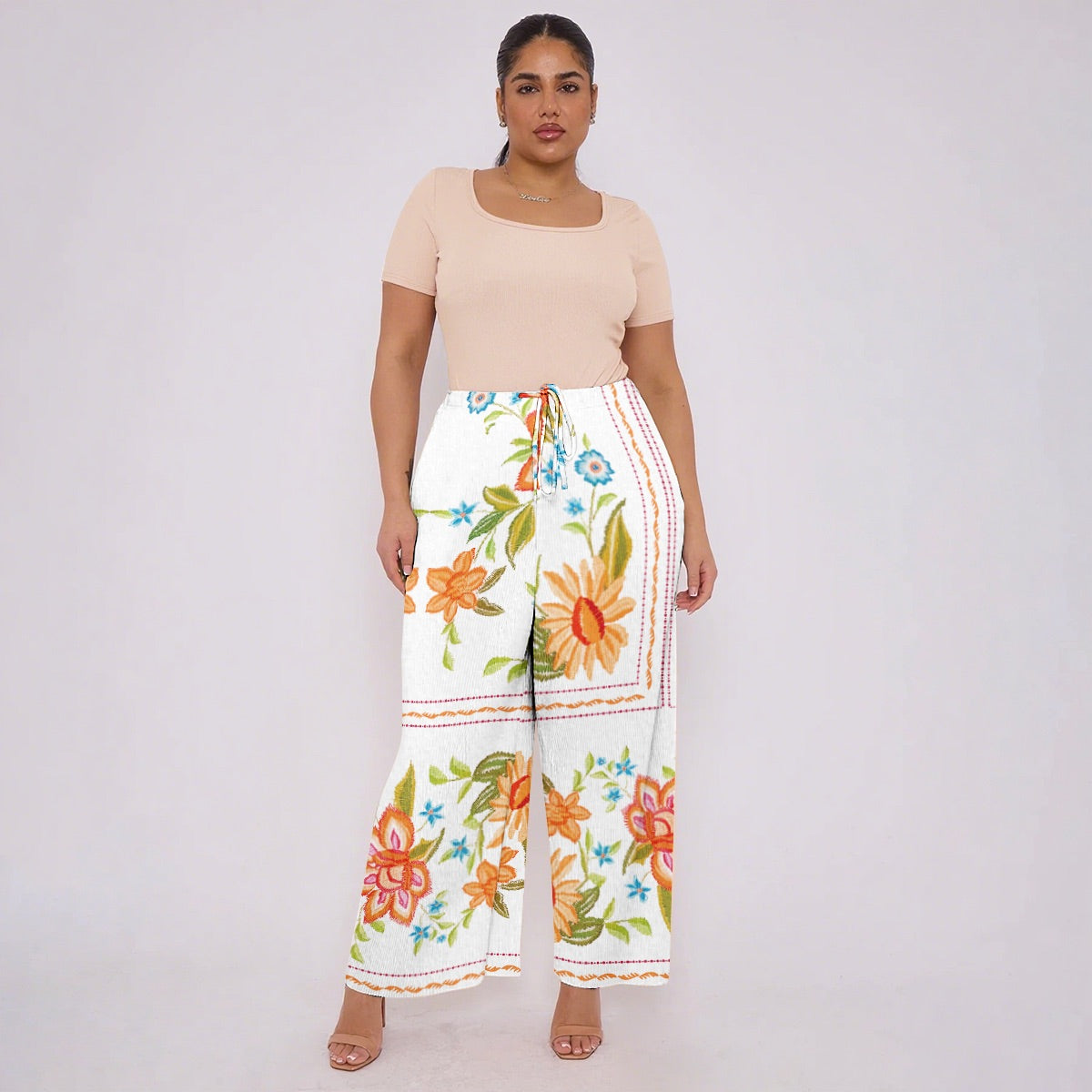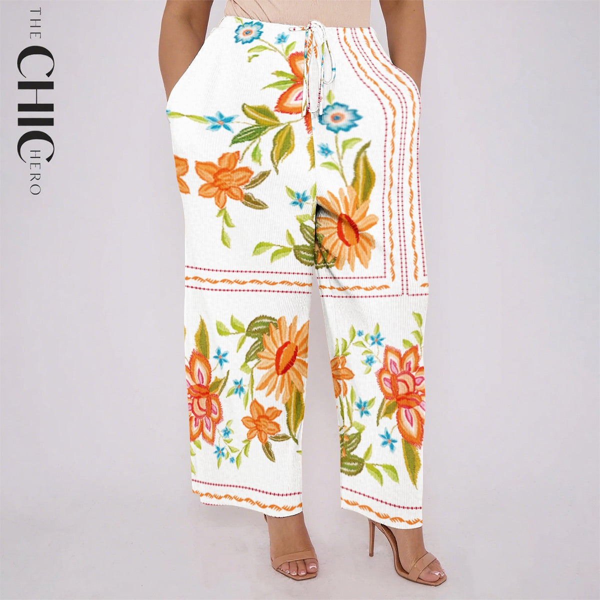 Colorful Floral Embroidery White Pants With Pockets