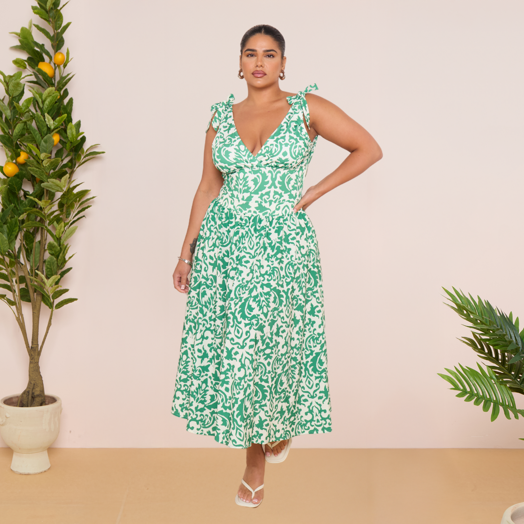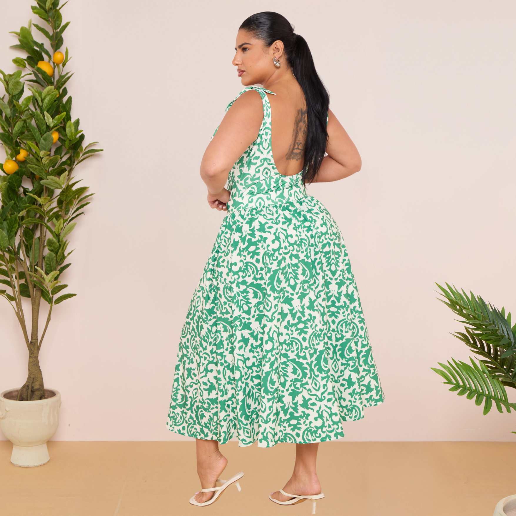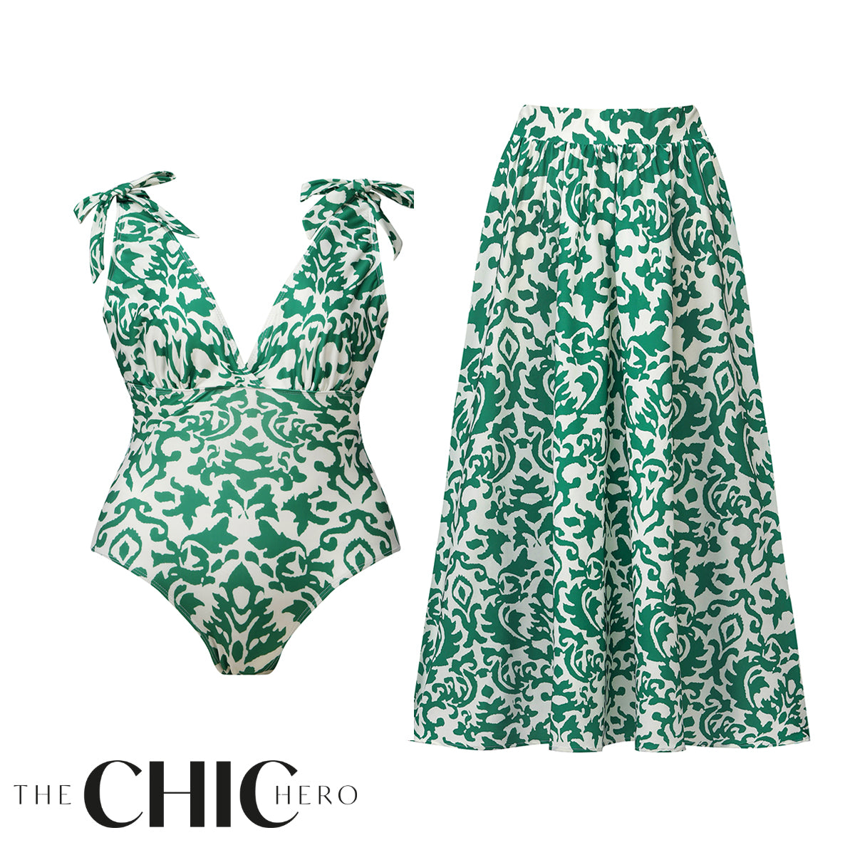 Green Boho Breeze Floral Tie-shoulder One Piece Swimsuit&Skirt