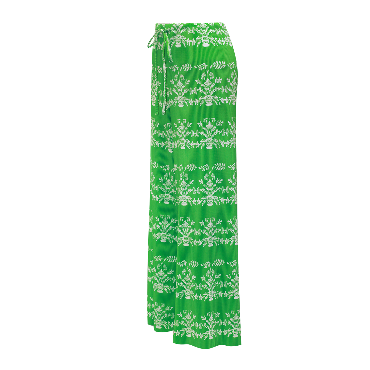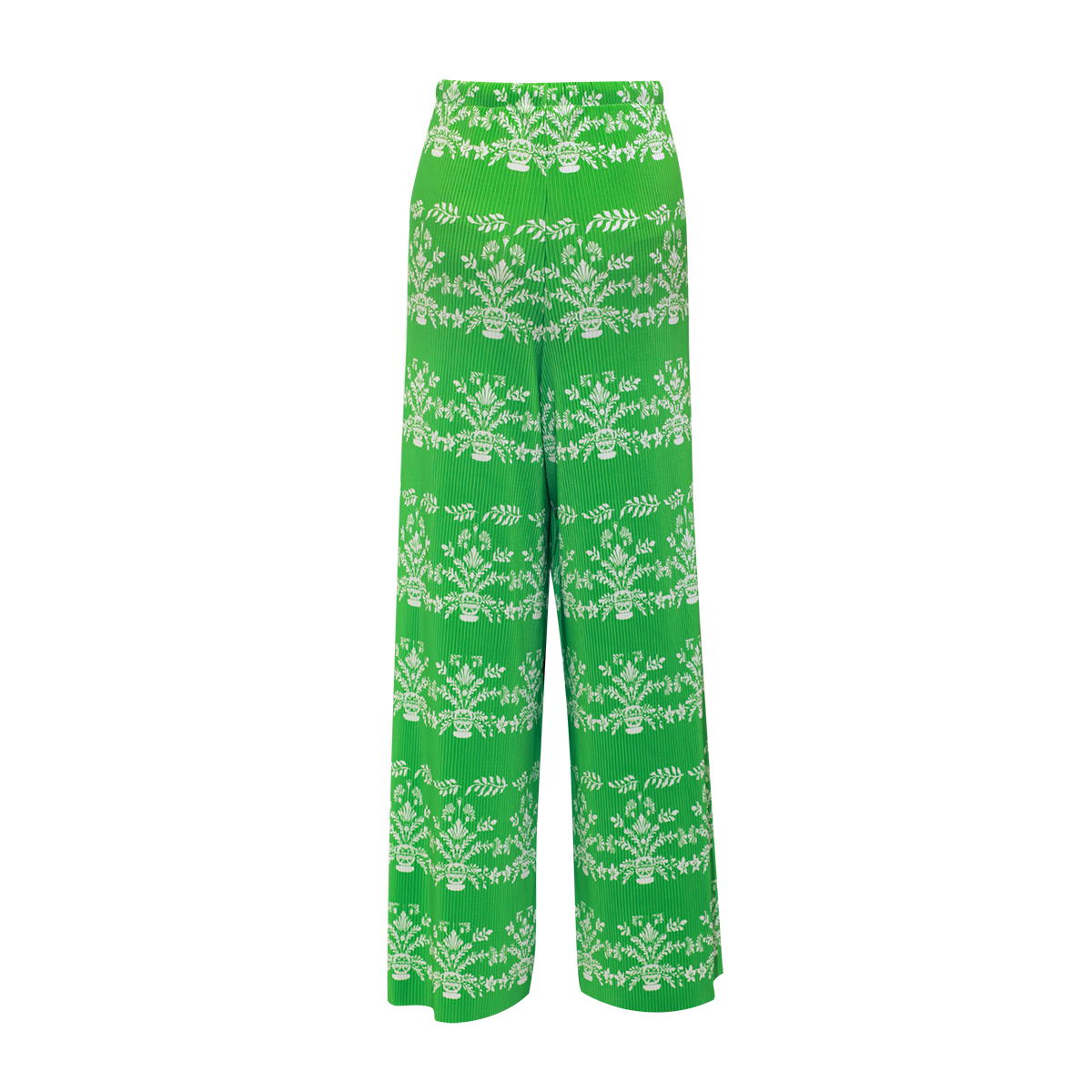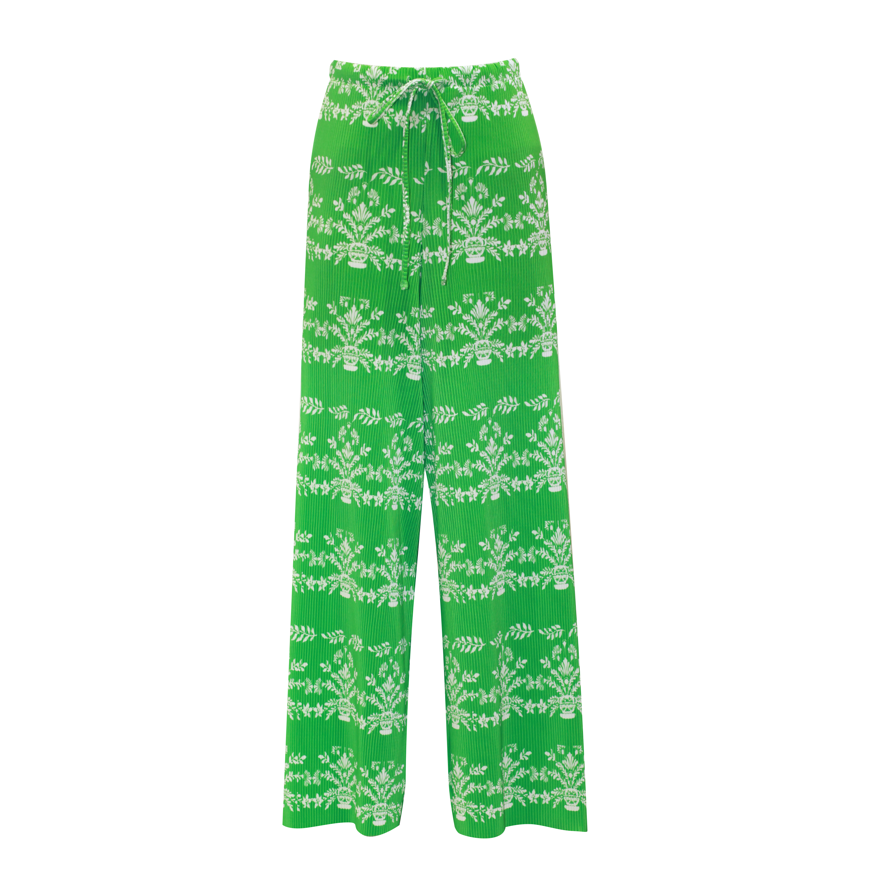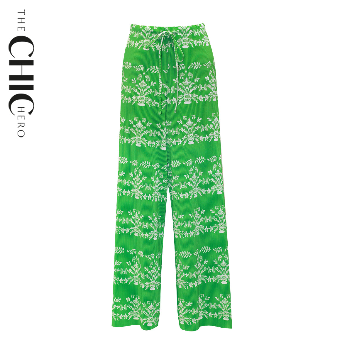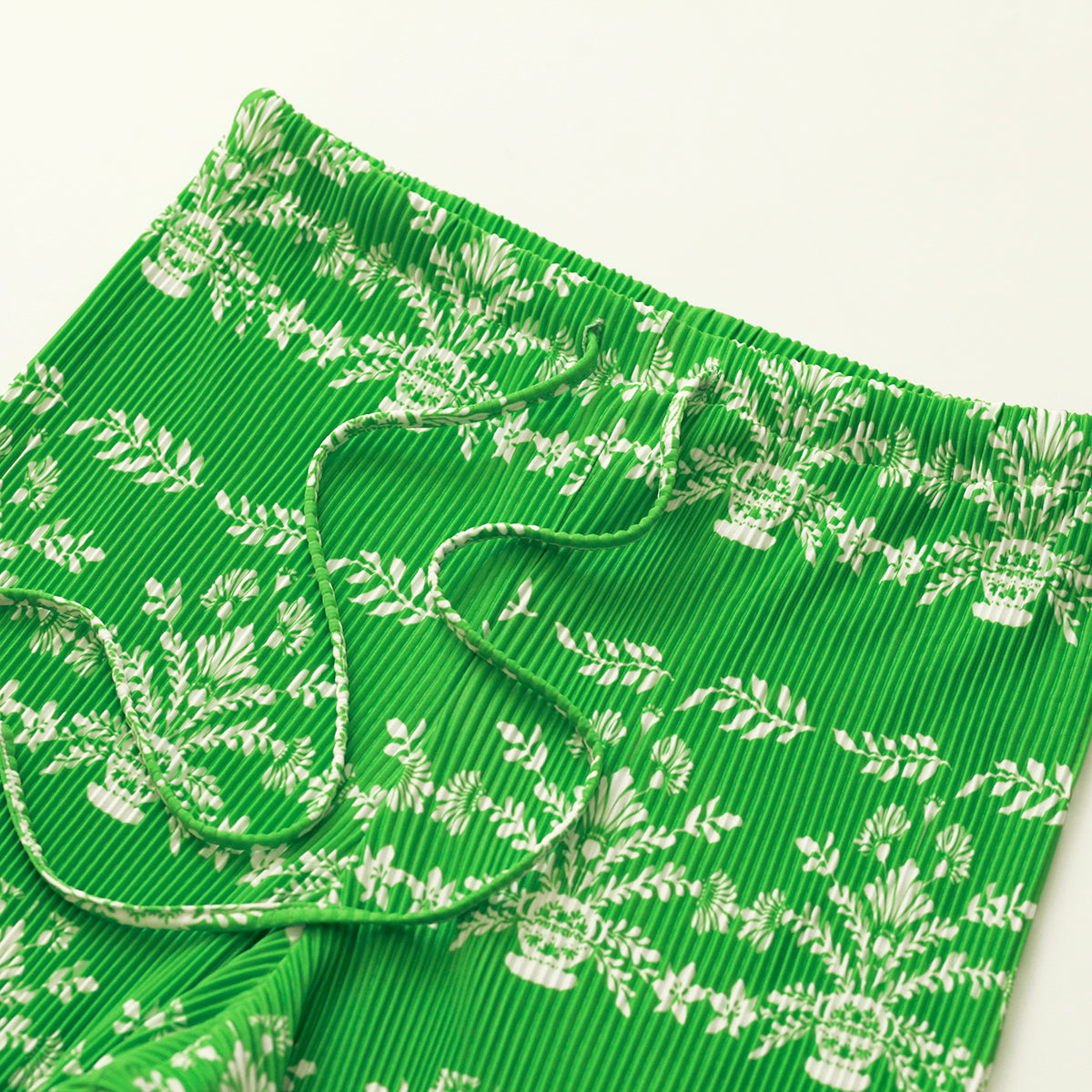 Green Elegant Floral Pot Patterns Drawstring Trousers Pleated Pants