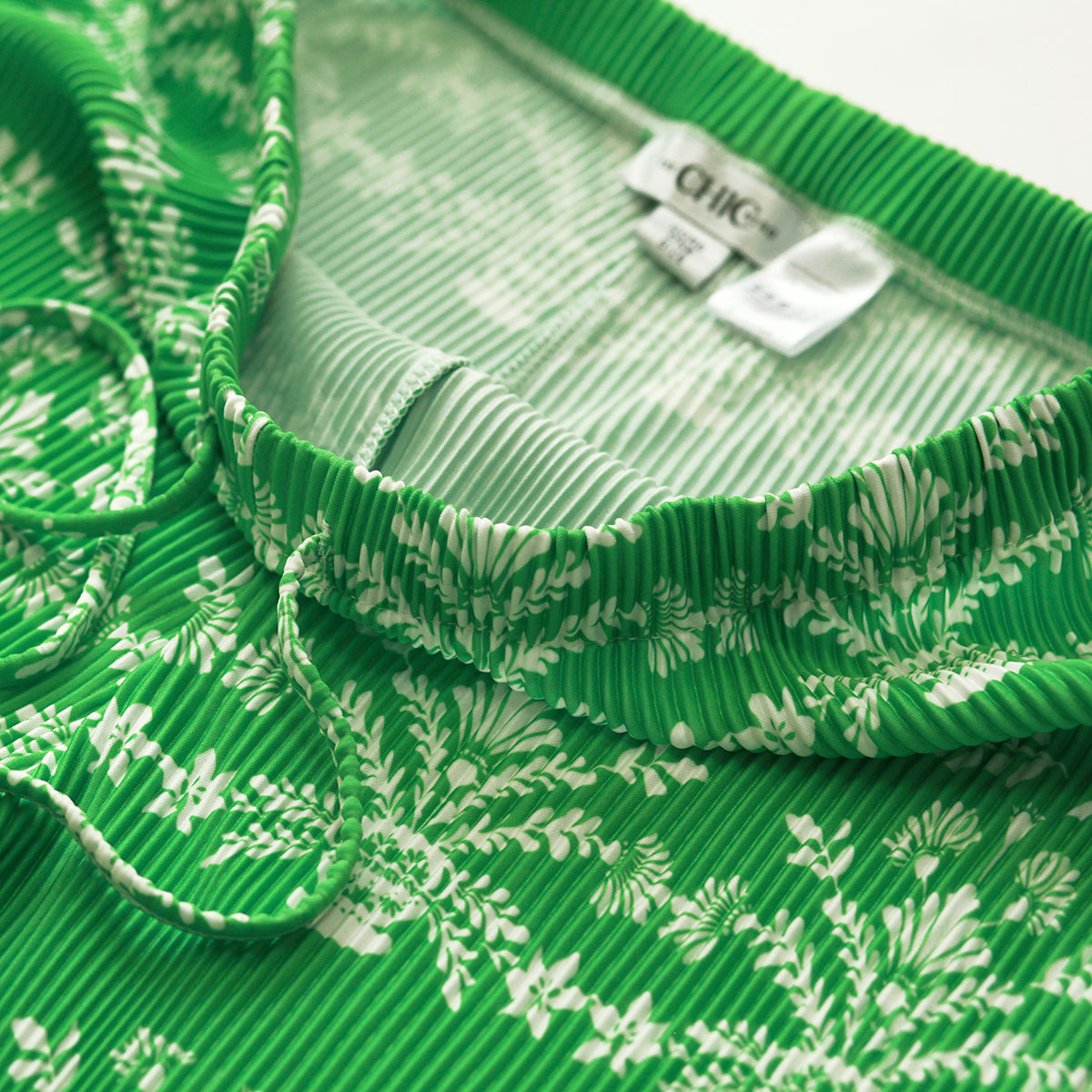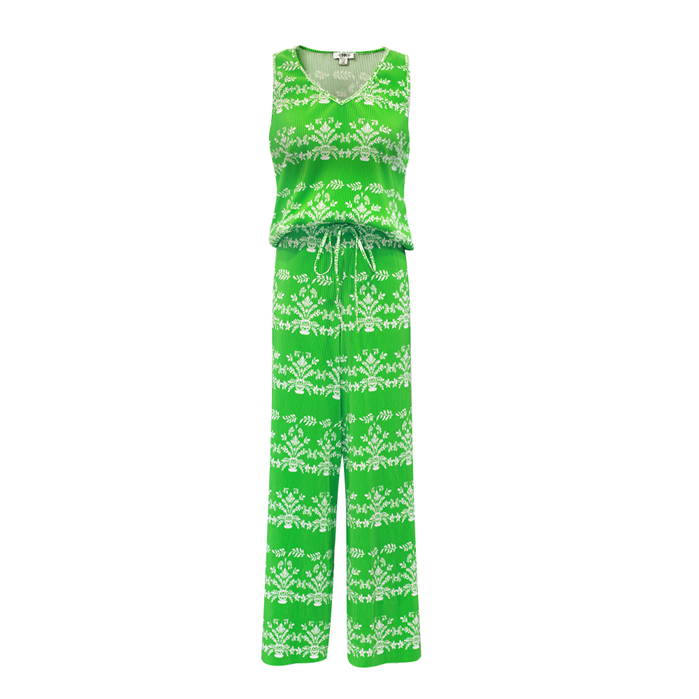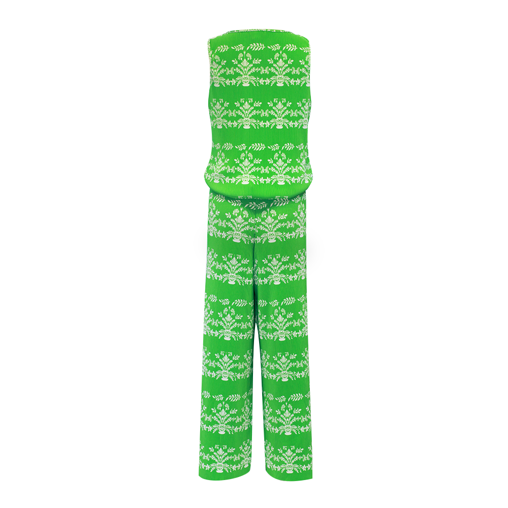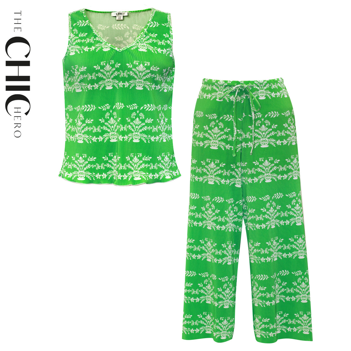 Green Elegant Floral Pot Patterns V-Neck Vest Top & Pleated Pants