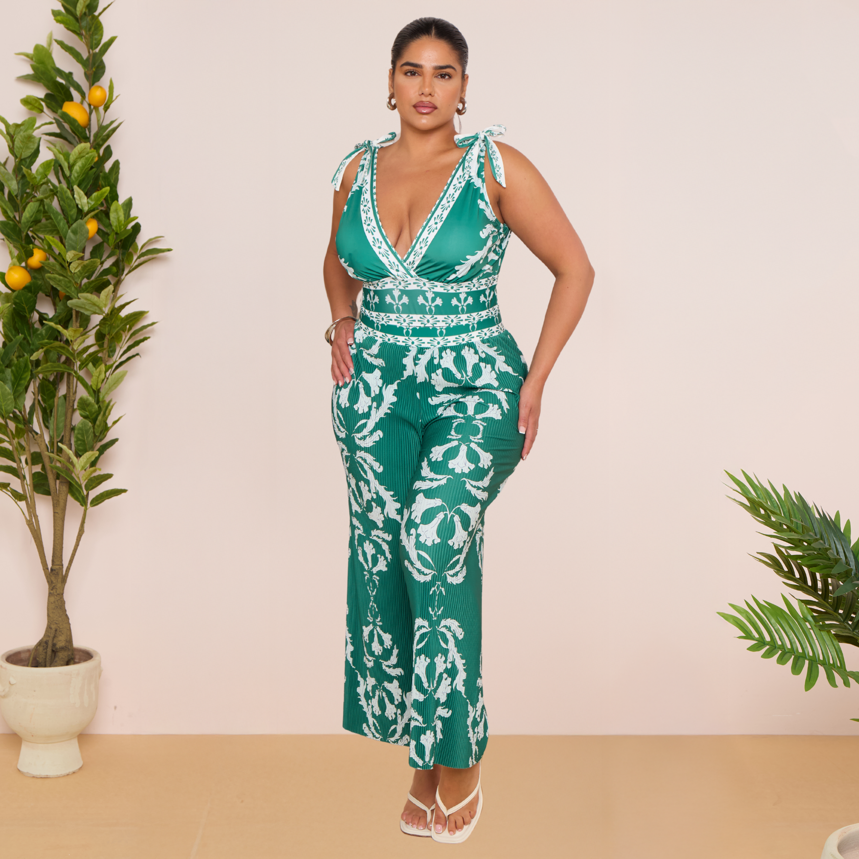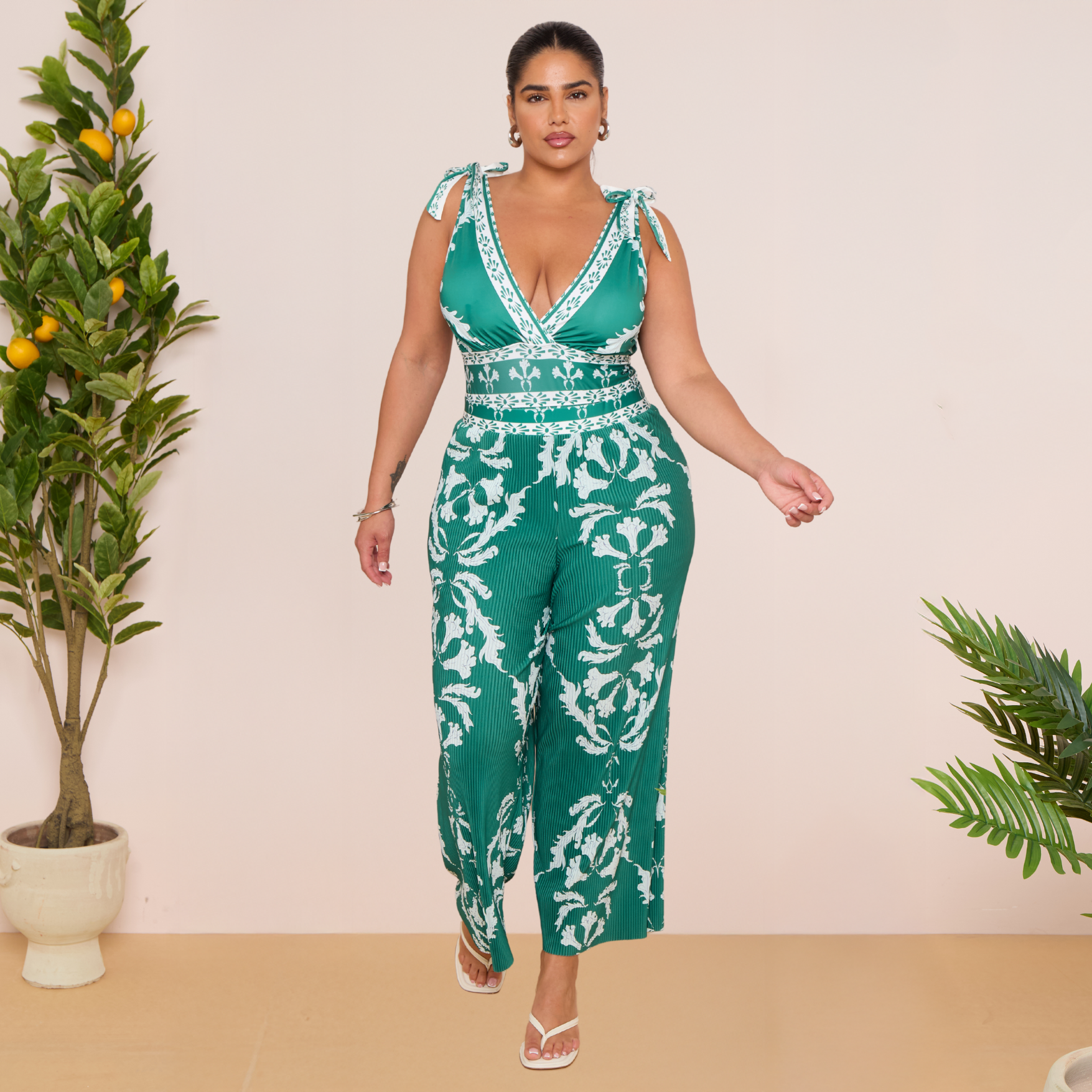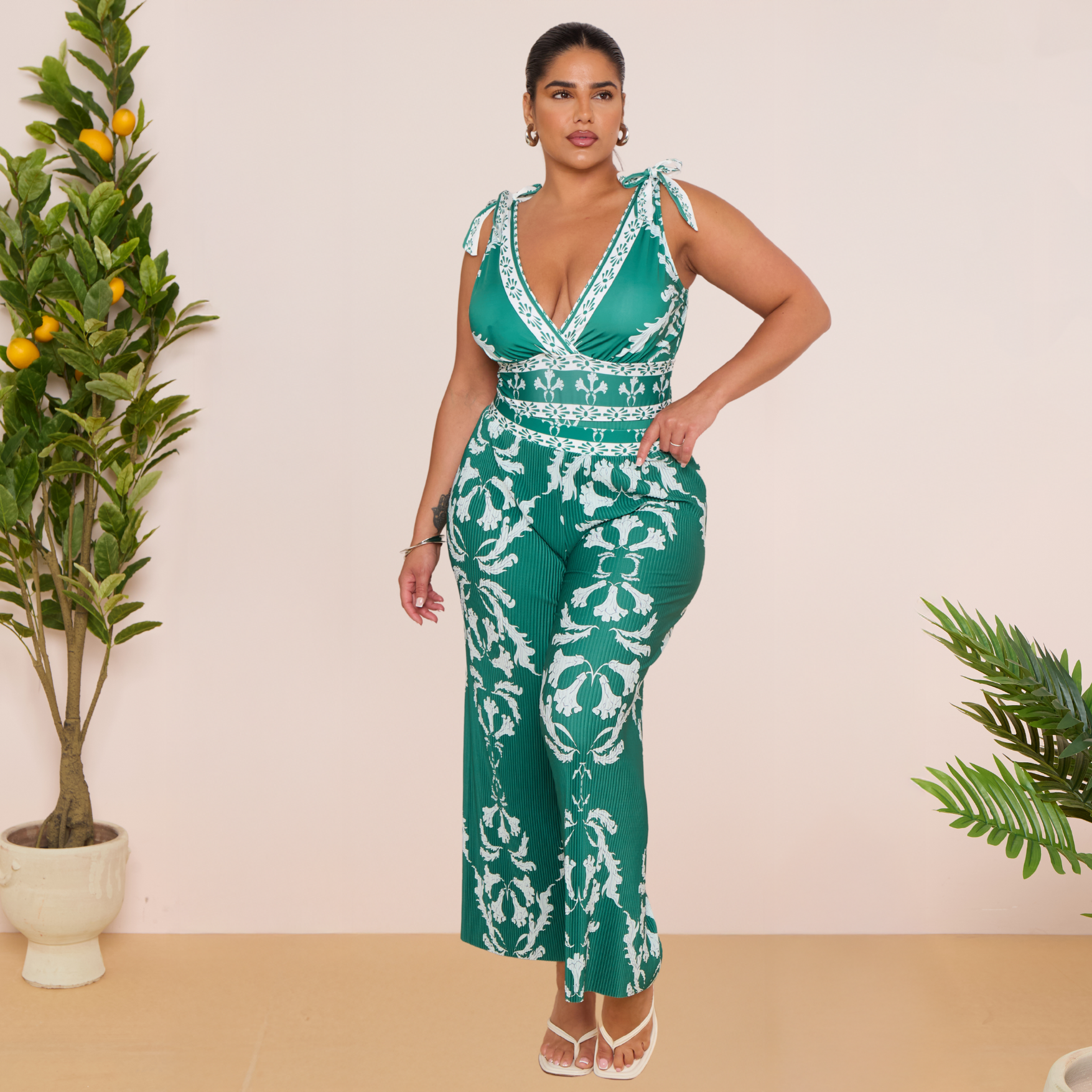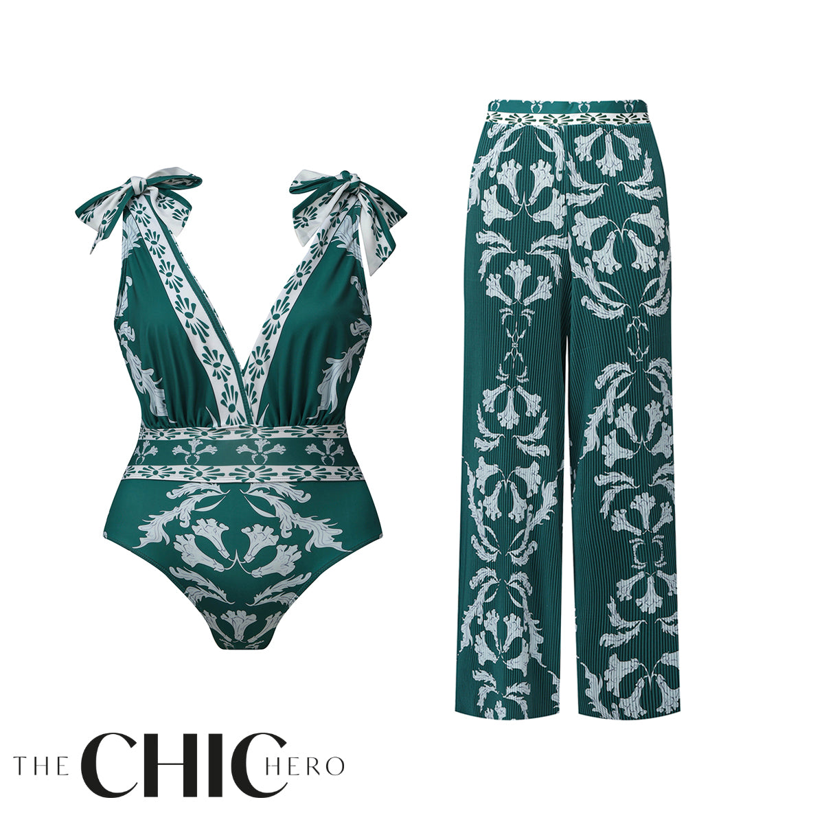 Green Flowy Floral Tie-shoulder Swimsuit&Pants