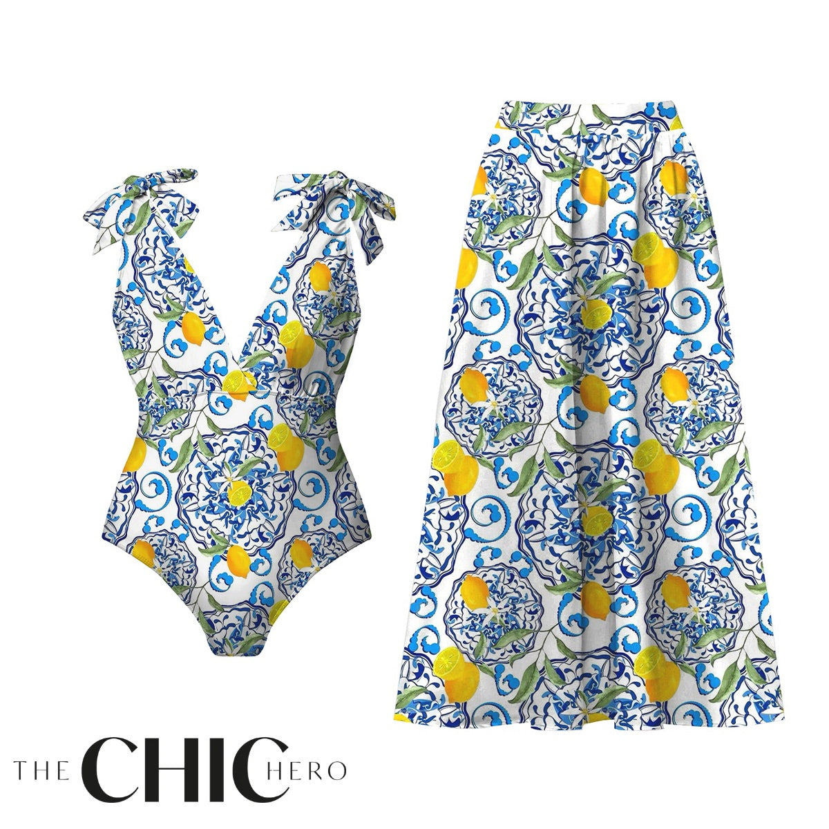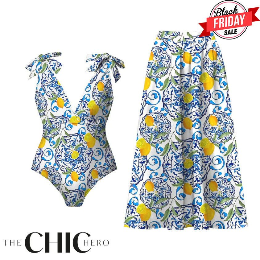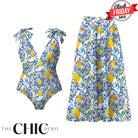 Lemon Motifs Blue Scrollwork Ornate Print One-Piece Swimsuit&Skirt