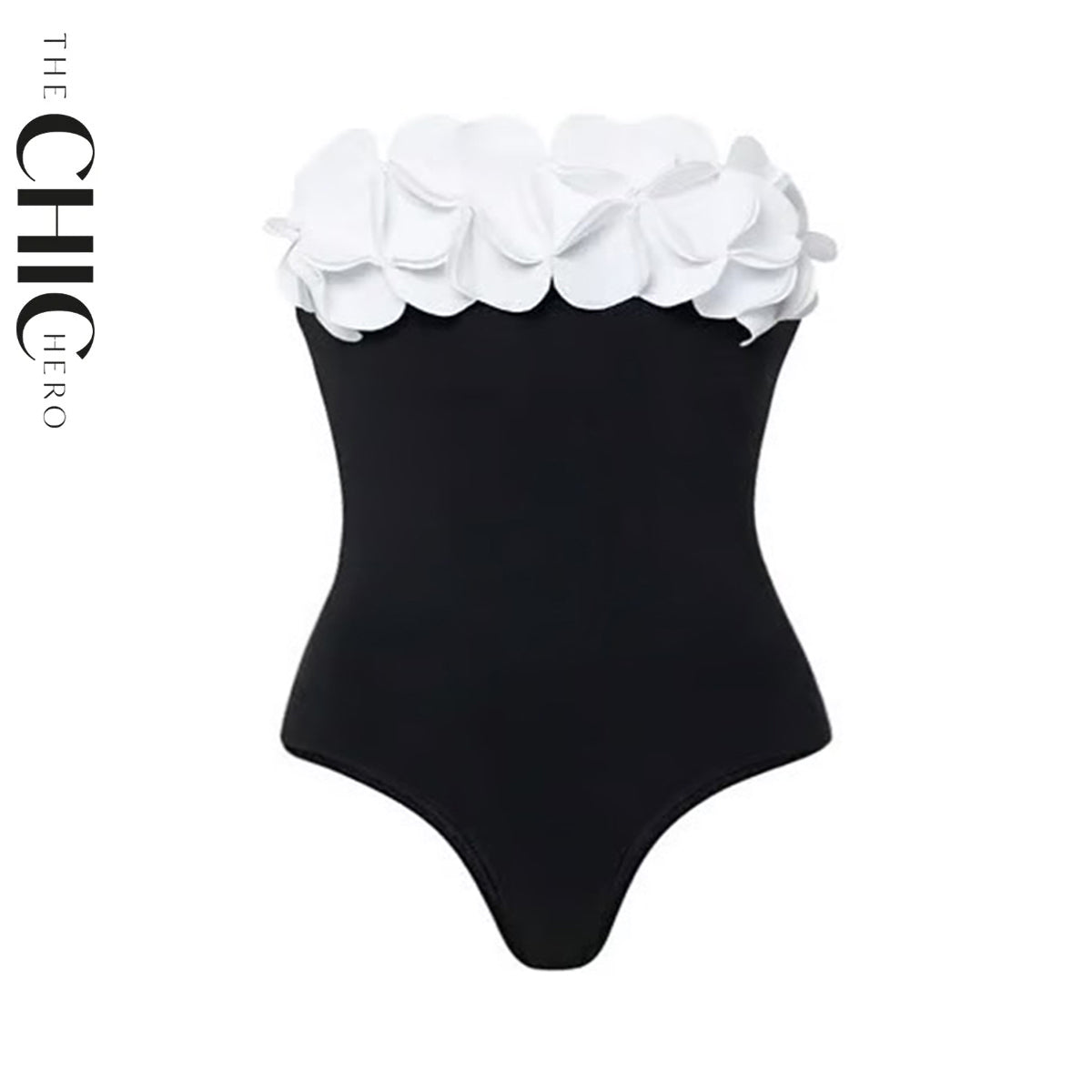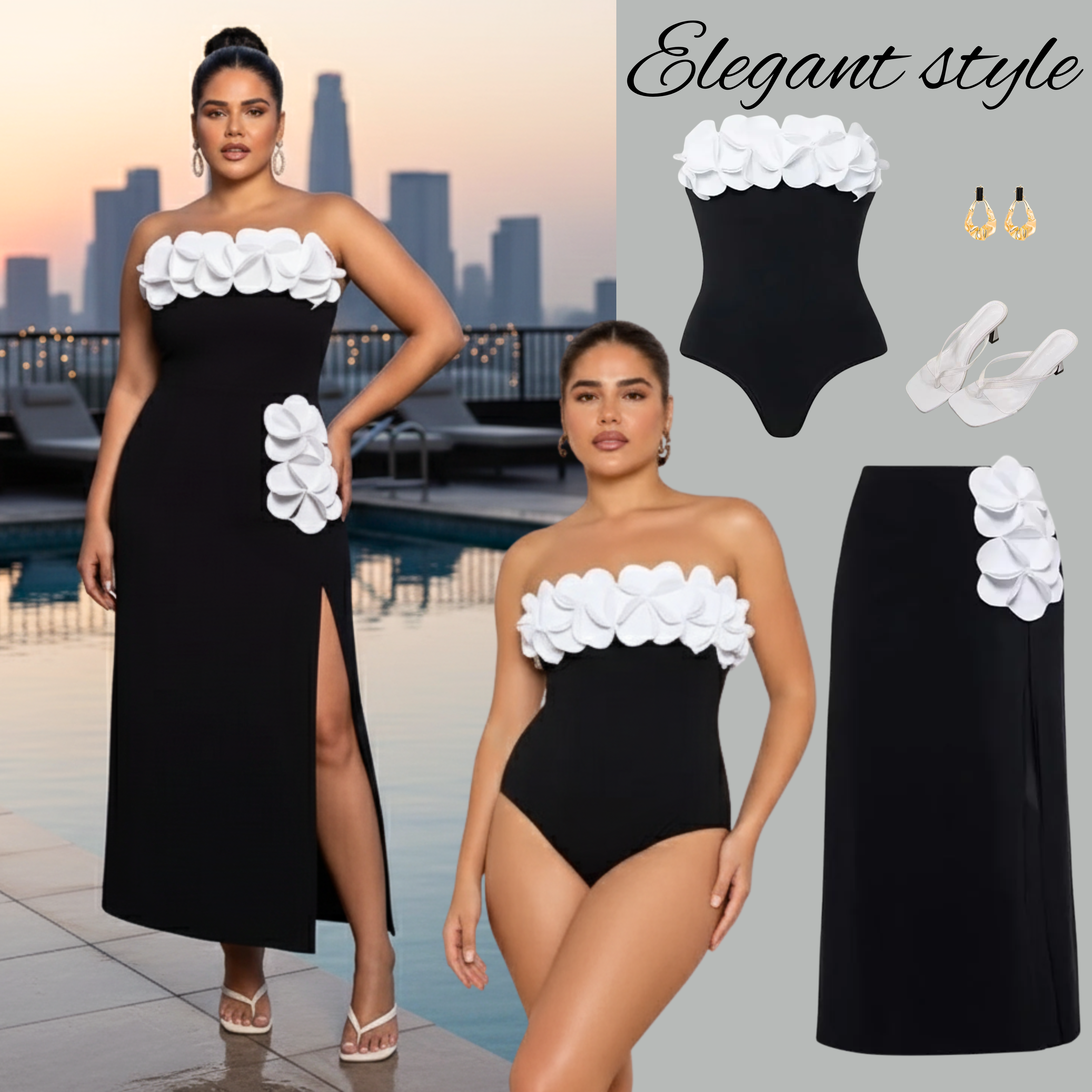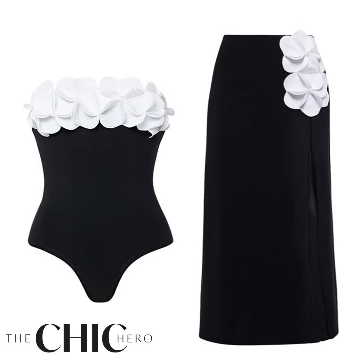 Vintage Black Floral Print One-Piece Swimsuit&Skirt