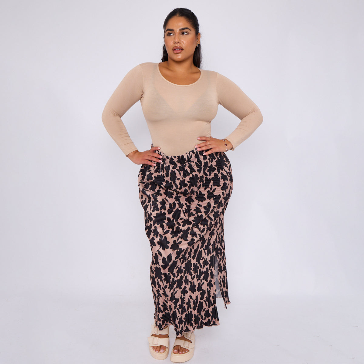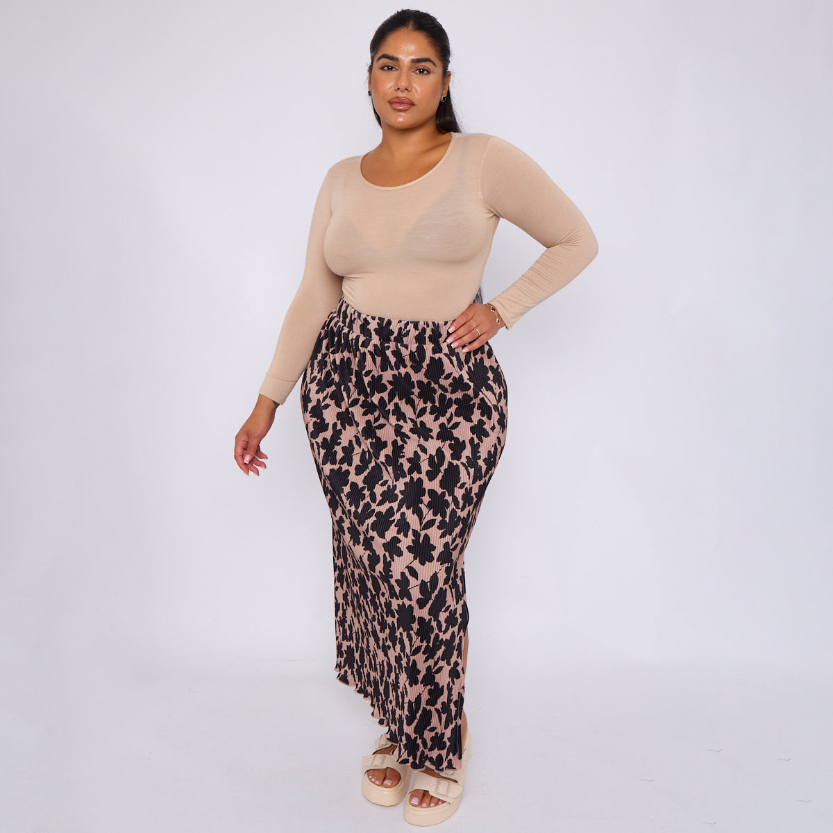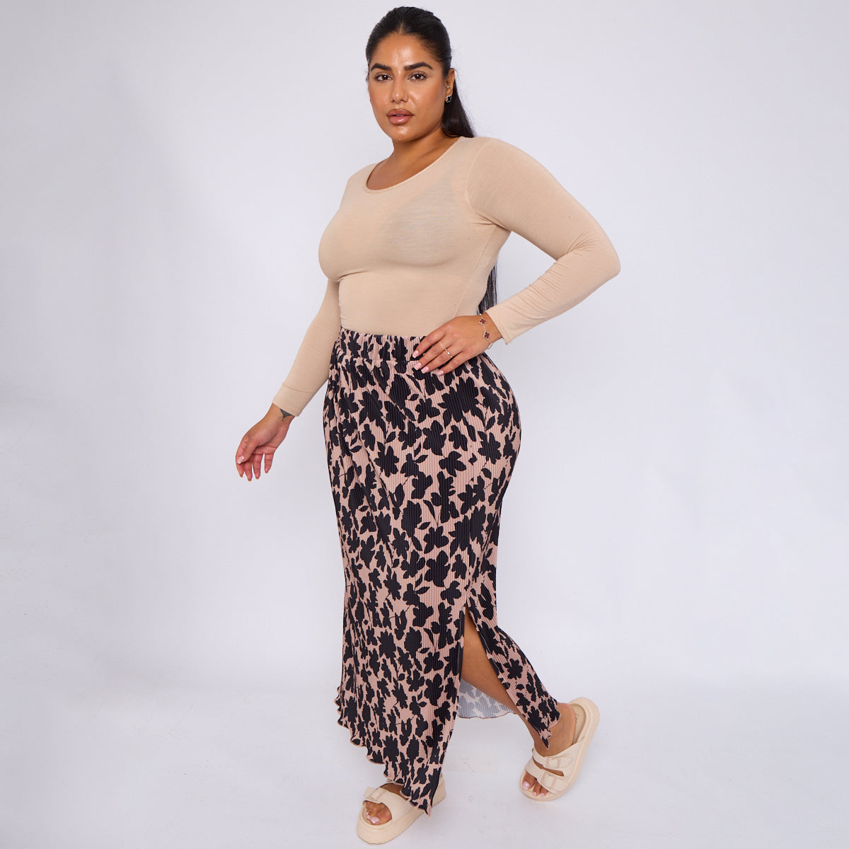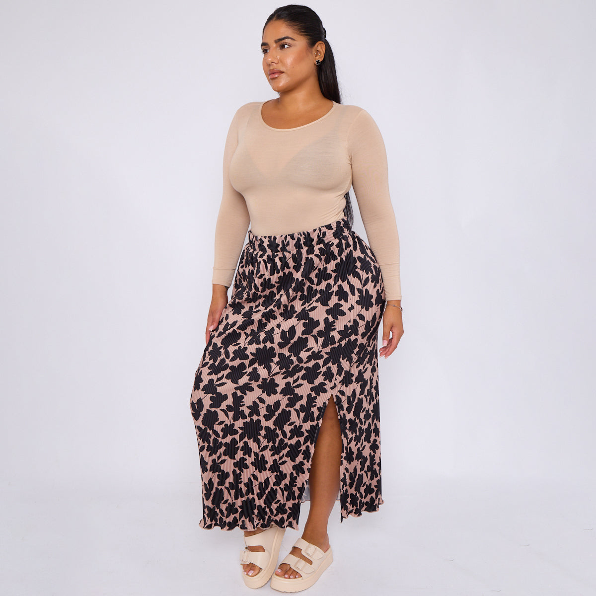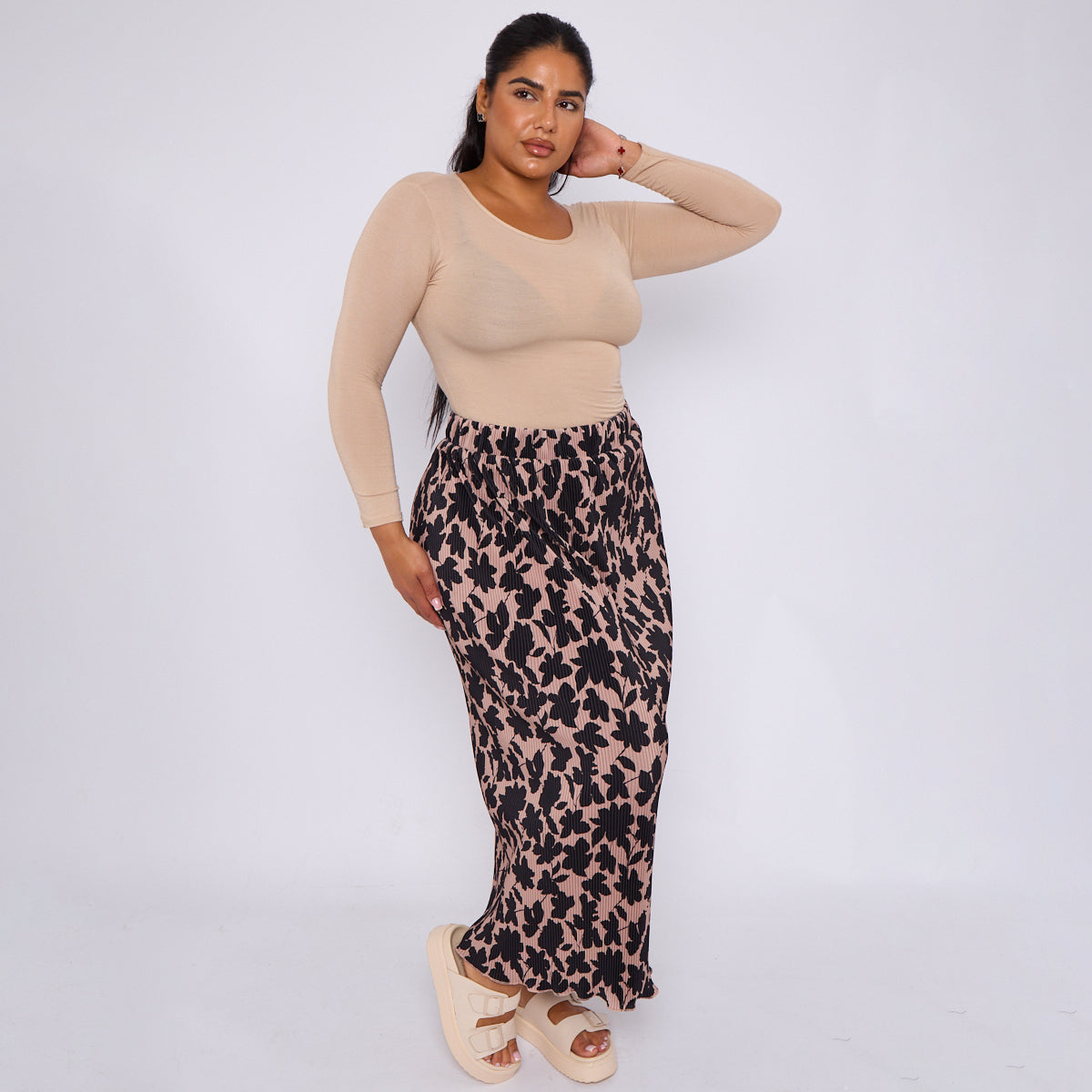 Red Leaves Print Monochrome Ripple Pleated Skirt