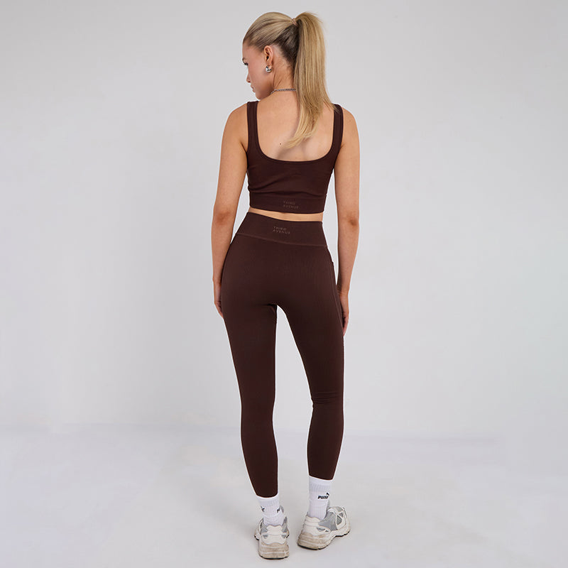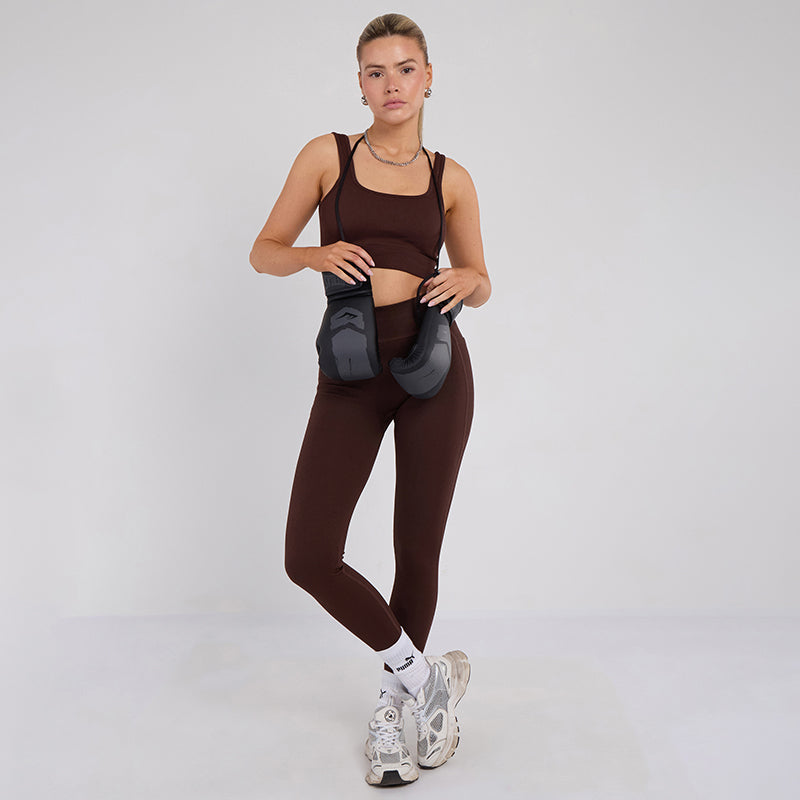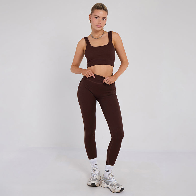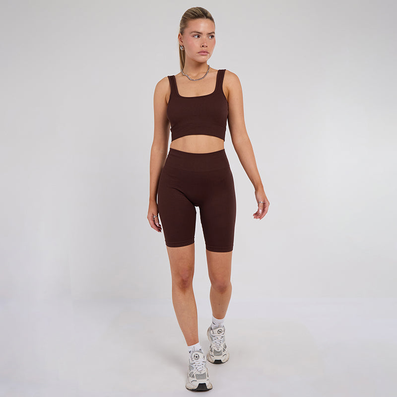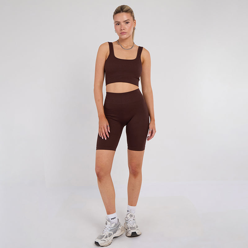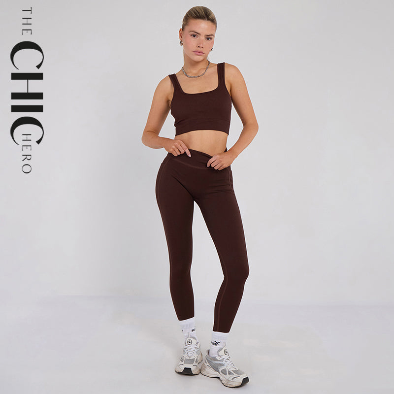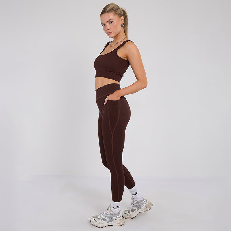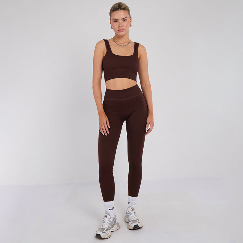 Stretch Coffee Brown Workout Outfit Seamless Sports Bra & High-Waist Leggings Set