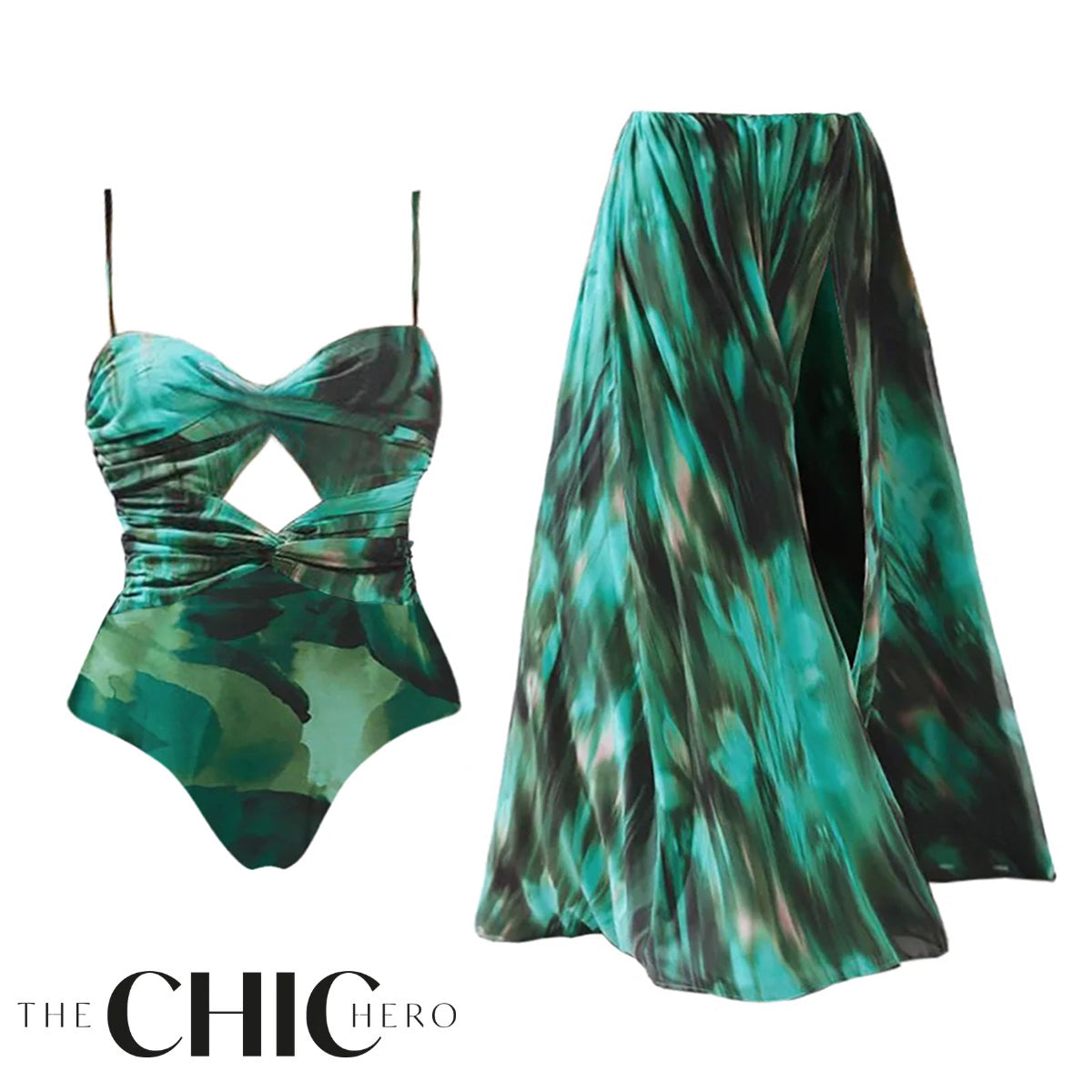 V Neck Gradient Green Print Swimsuit&Skirt