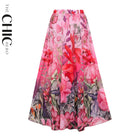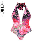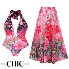 V Neck Pink vintage floral print Swimsuit&Skirt Set