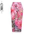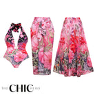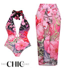 V Neck Pink vintage floral print Swimsuit&Skirt Set